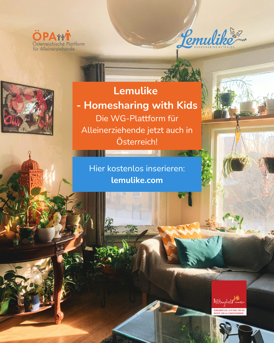 Nach dem erfolgreichen Start in Deutschland hat die ÖPA gemeinsam mit @lemulike.de die WG-Plattform für Alleinerziehende nach Österreich gebracht. Die Plattform ist ganz neu – das heißt: Je mehr mitmachen, desto schneller wächst die Auswahl an Wohnmöglichkeiten. Ob mit freiem Zimmer, auf Wohnungssuche oder bereit für eine gemeinsame WG-Neugründung – tragt euch hier kostenlos ein: www.lemulike.com. Macht mit und nutzt die Möglichkeit zur Vernetzung! ✨