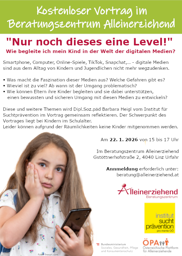 Anmeldung: beratung@alleinerziehend.at oder Tel.Nr.: 0732/654270